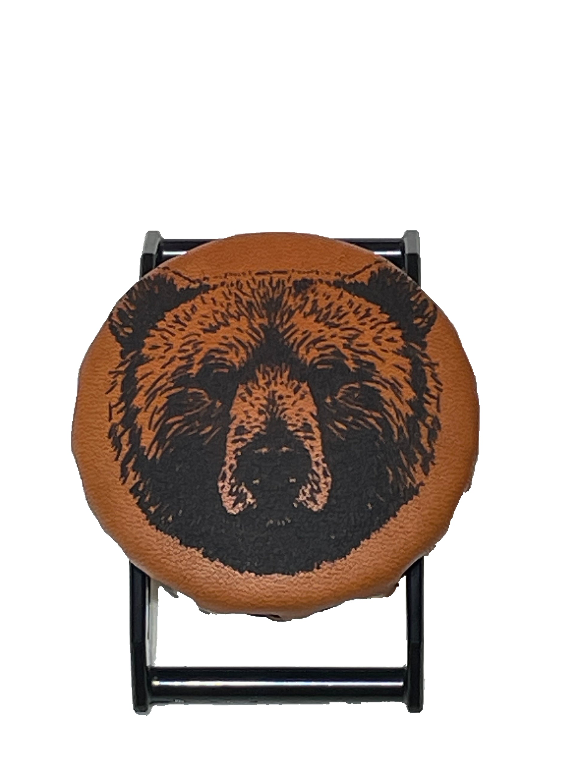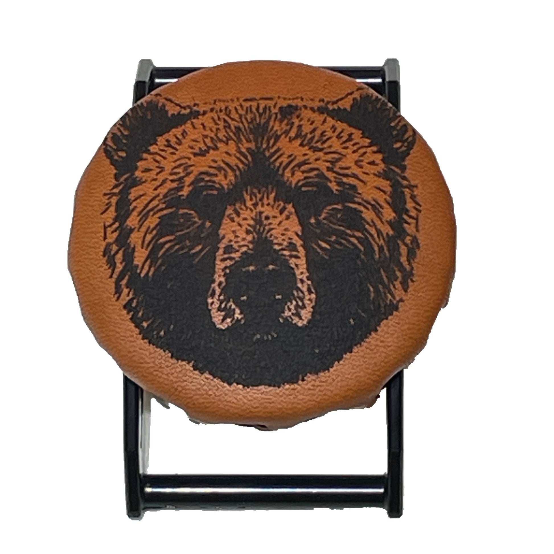 Laser Engraved Bear on Burnt Orange Leather on Black SPEC. Includes a black Molle compatible clip