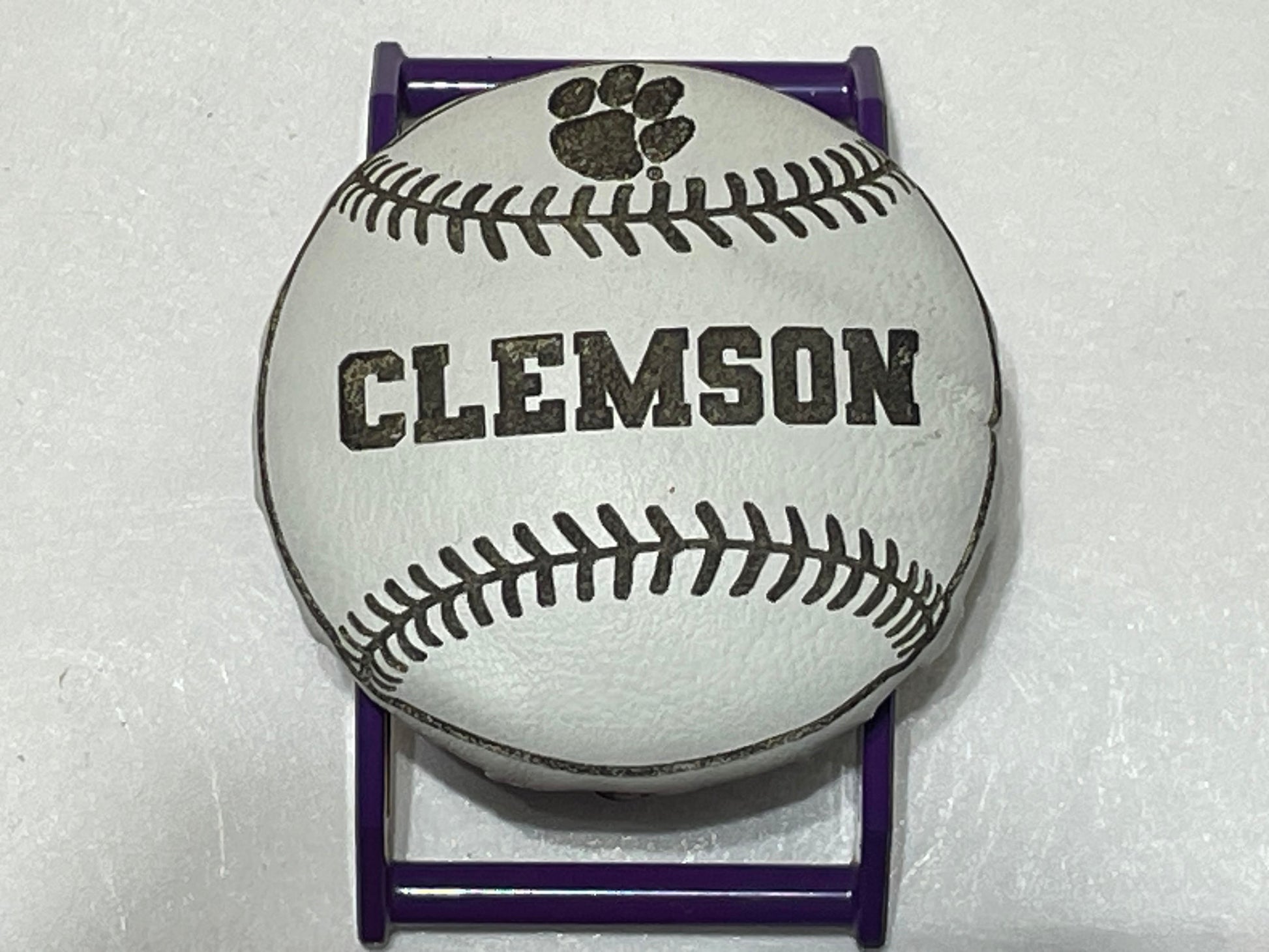 White Leather Baseball With Tiger Paw on Purple SPEC. Includes a black Molle compatible clip