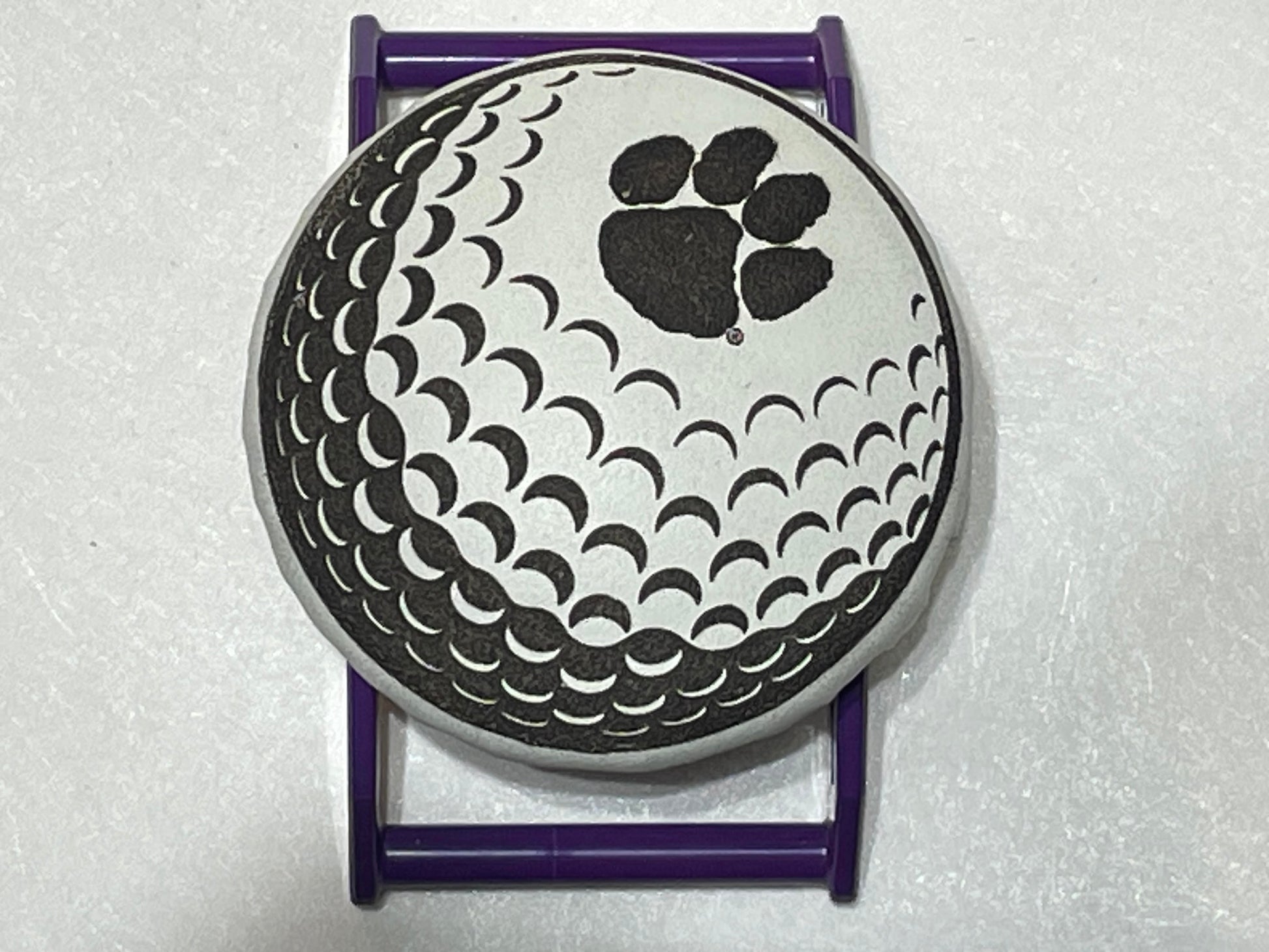 White Leather Golf Ball With Tiger Paw on Purple SPEC. Includes a black Molle compatible clip