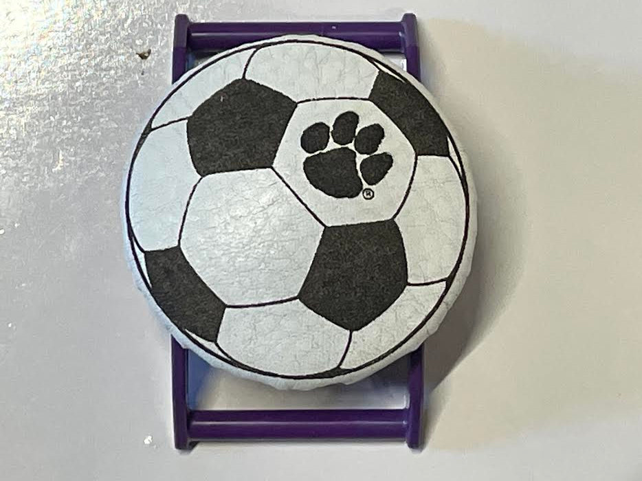 White Leather Soccer Ball With Tiger Paw on Purple SPEC. Includes a black Molle compatible clip