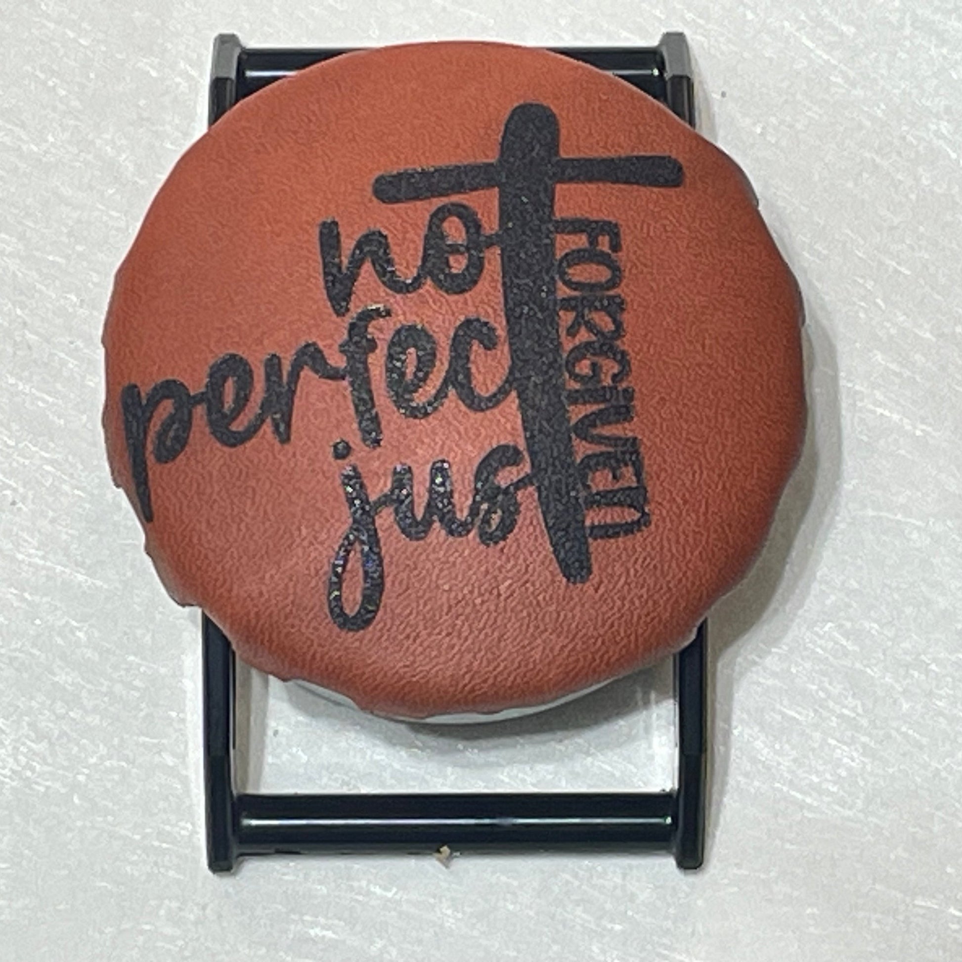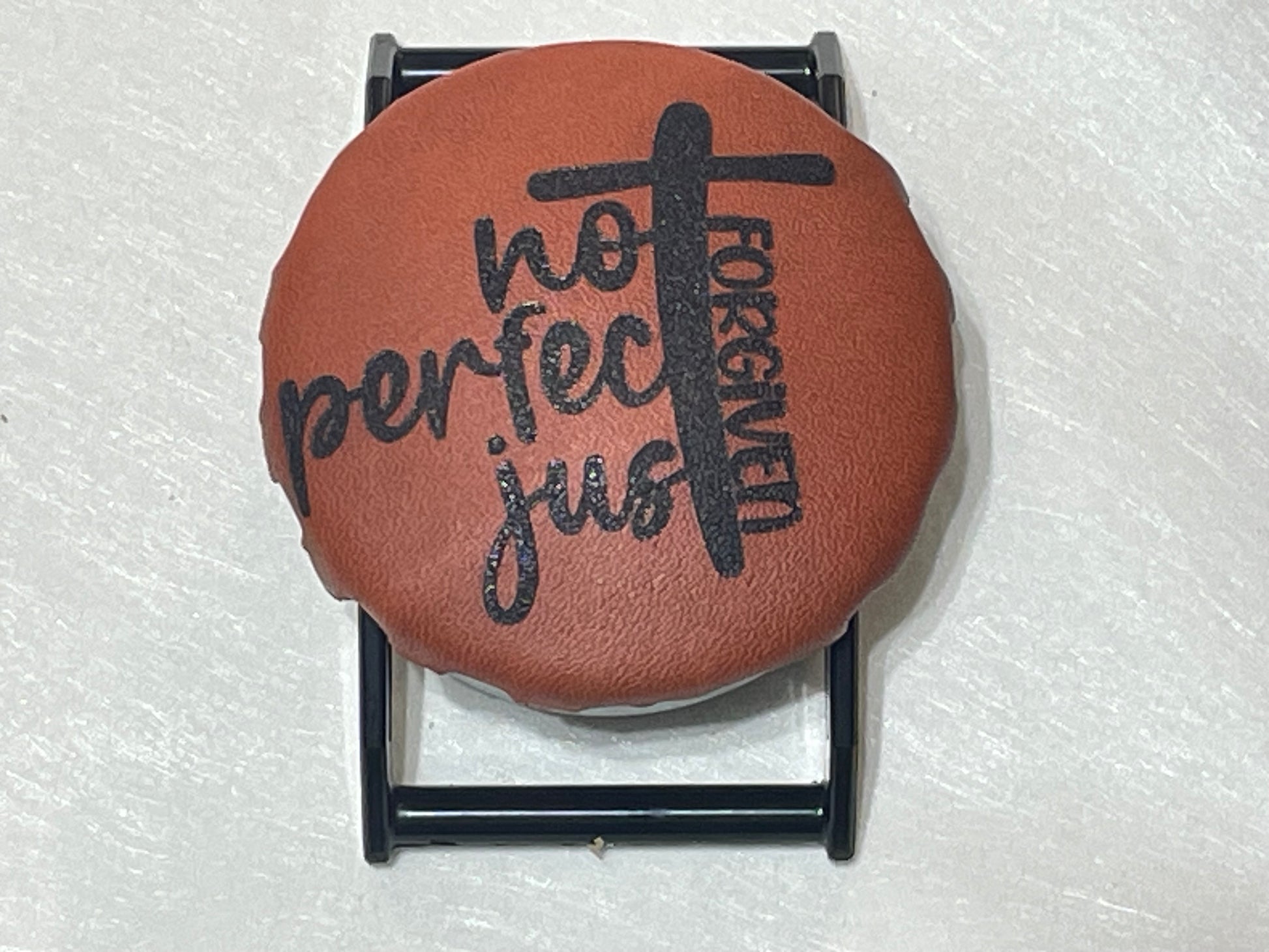 Laser Engraved Grace/Cross on Burnt Orange Leather mounted to a Black SPEC. All SPECs come with a black Molle compatible clip.