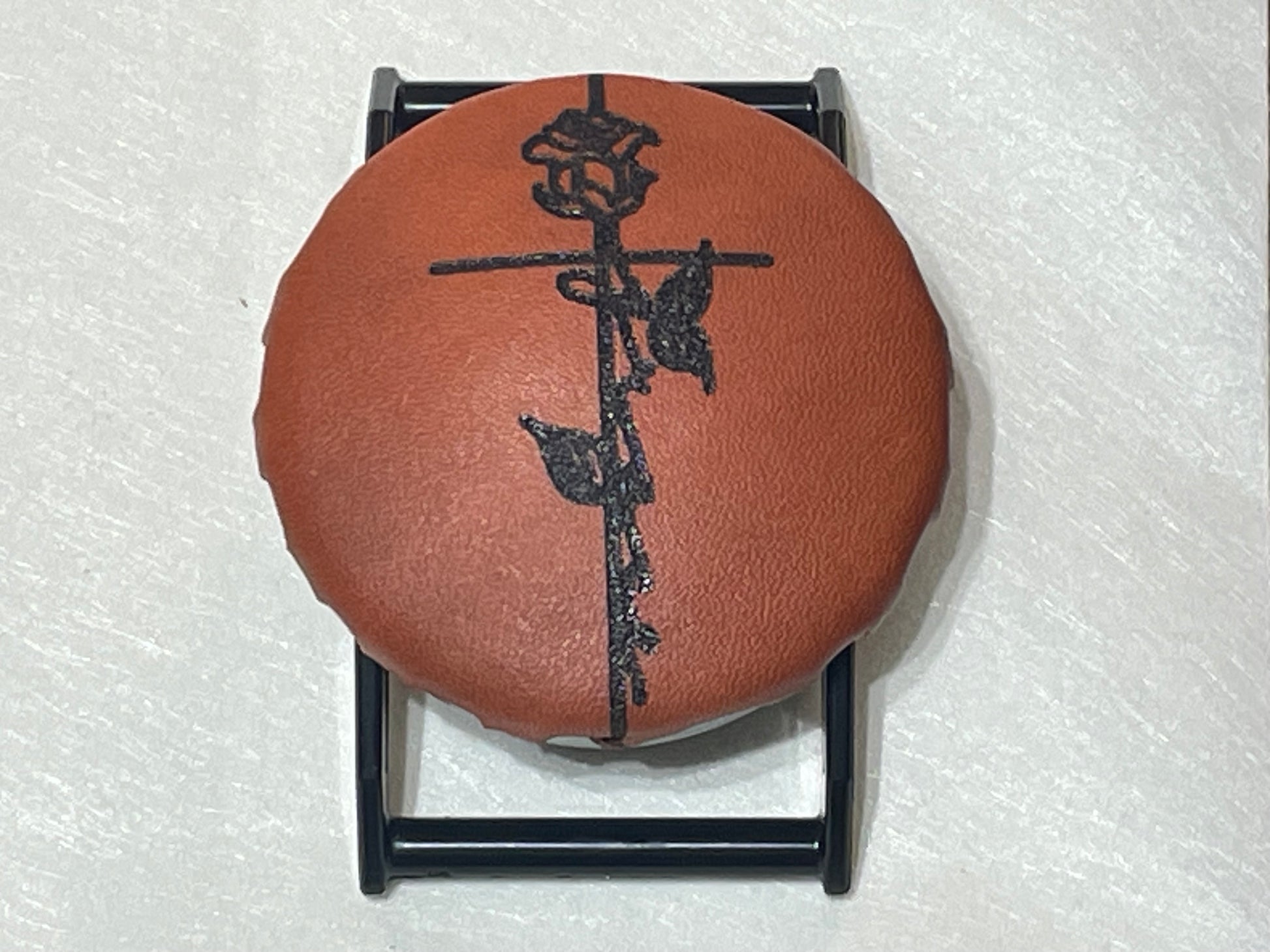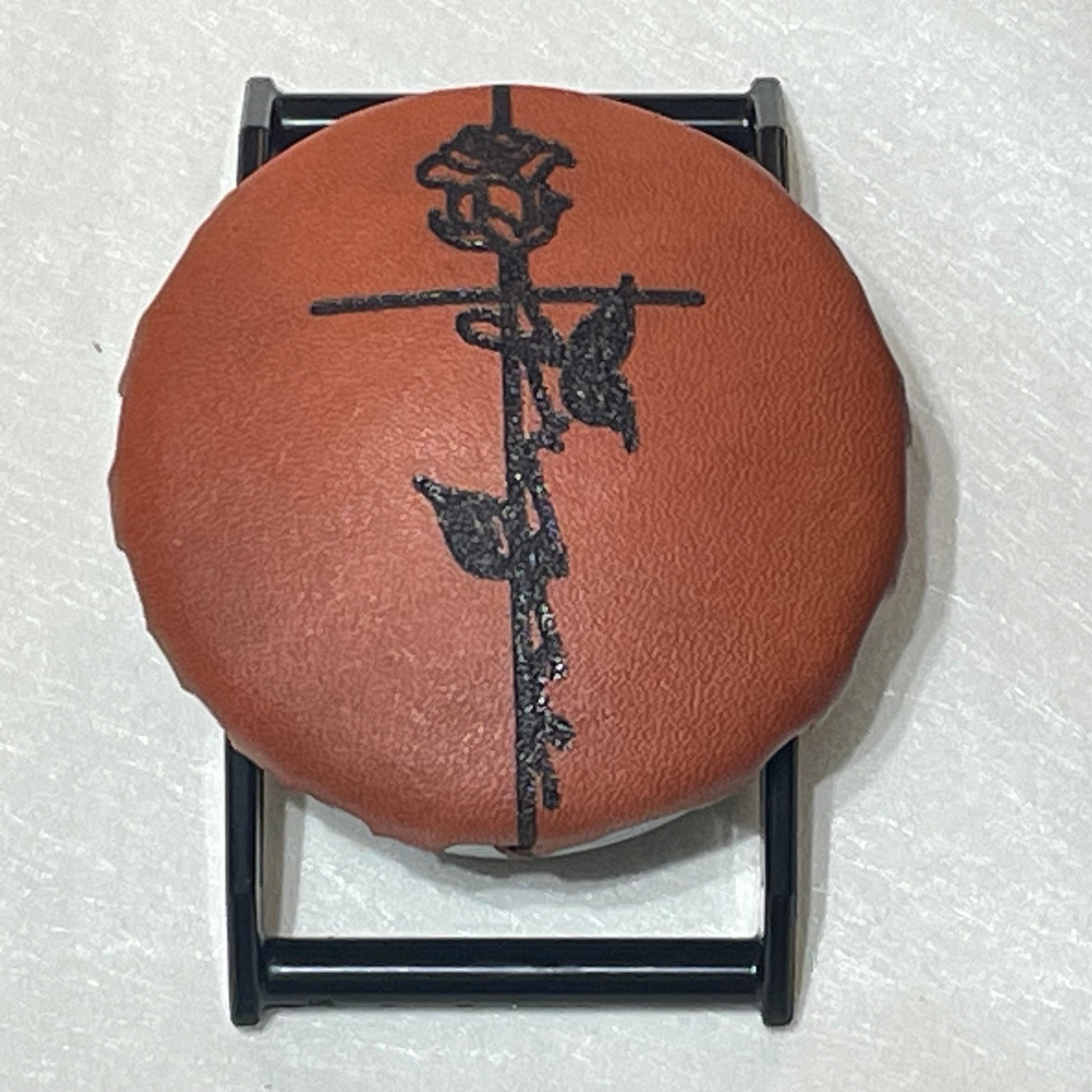 Laser Engraved Grace/Cross on Burnt Orange Leather mounted to a Black SPEC. All SPECs come with a black Molle compatible clip.