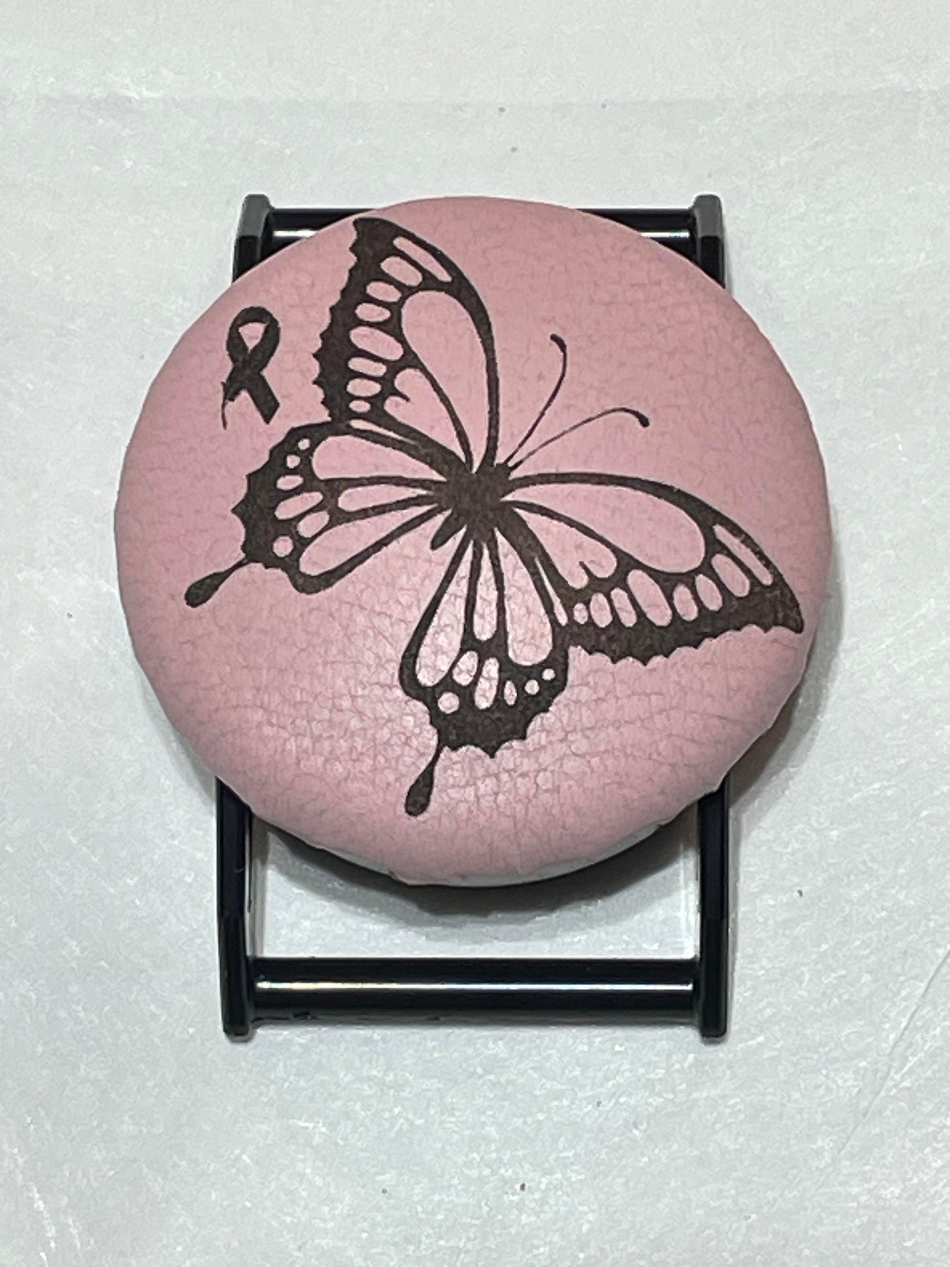 Laser Engraved Butterfly and BC Awareness Symbol on Pink Leather mounted to a black SPEC. All SPECs come with a black Molle compatible clip.