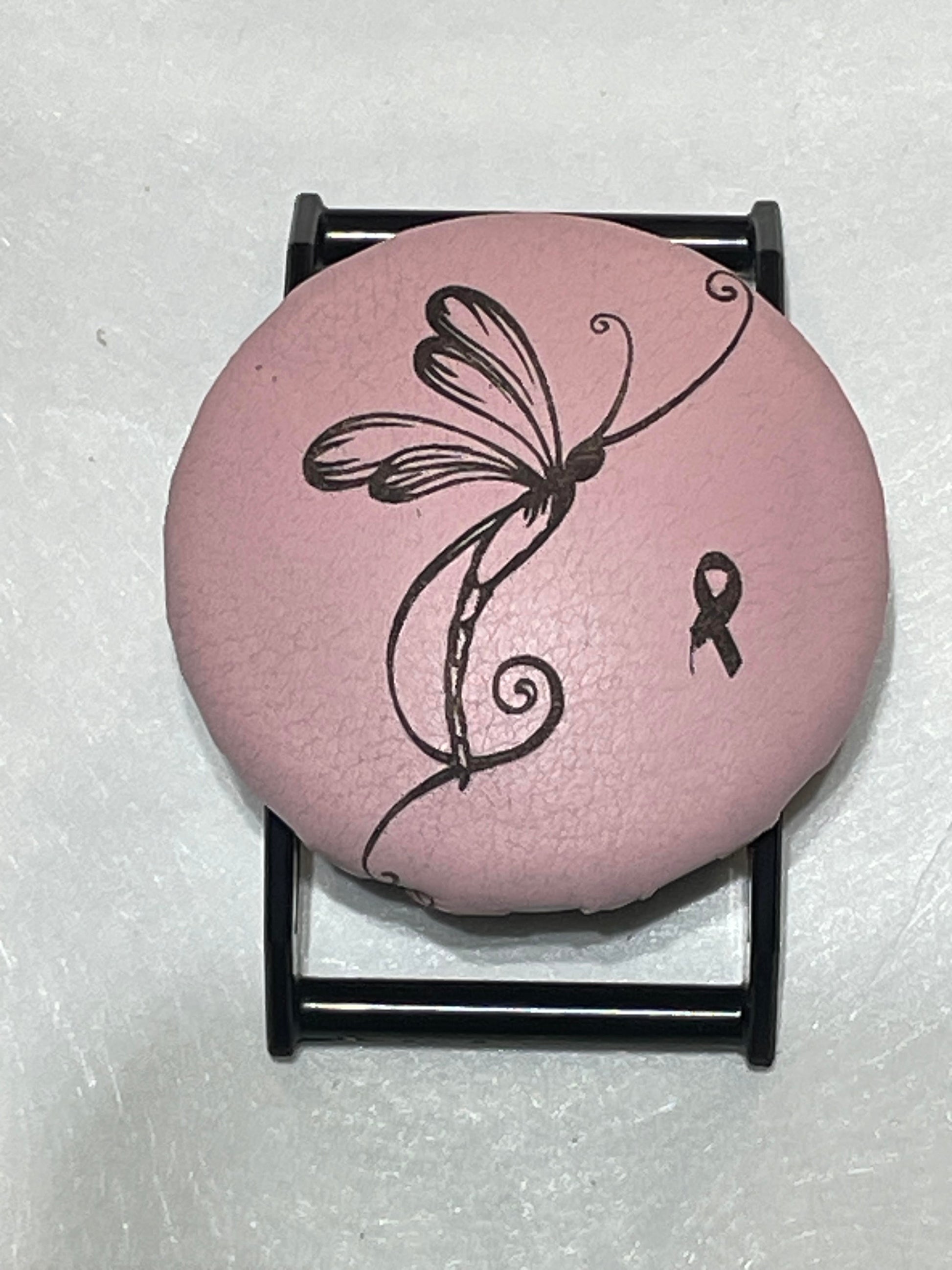 Laser Engraved Dragonfly and BC Awareness Symbol on Pink Leather mounted to a black SPEC. All SPECs come with a black Molle compatible clip.