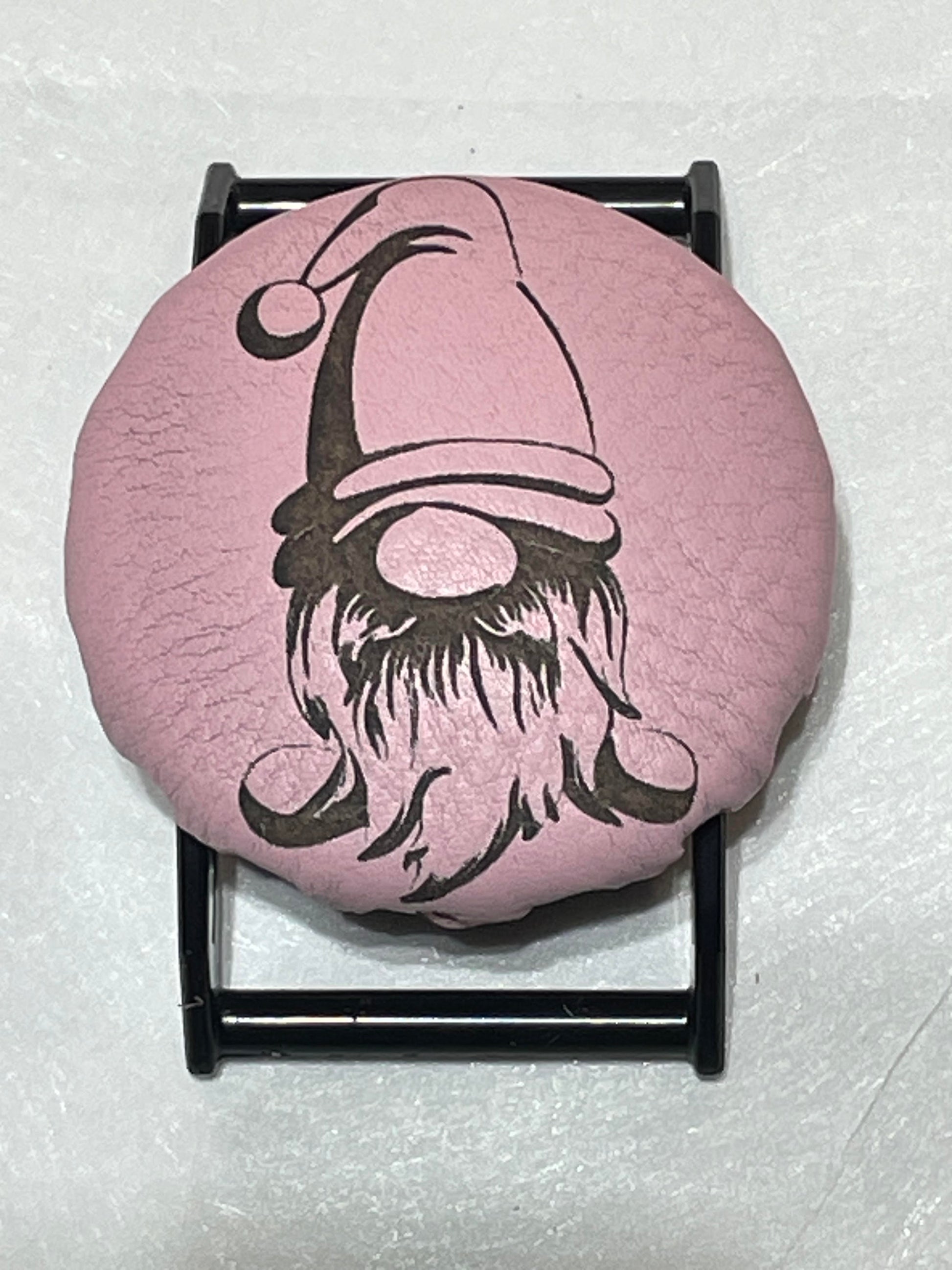 Laser Engraved Gnome on Pink Leather mounted to a black SPEC. All SPECs come with a black Molle compatible clip.