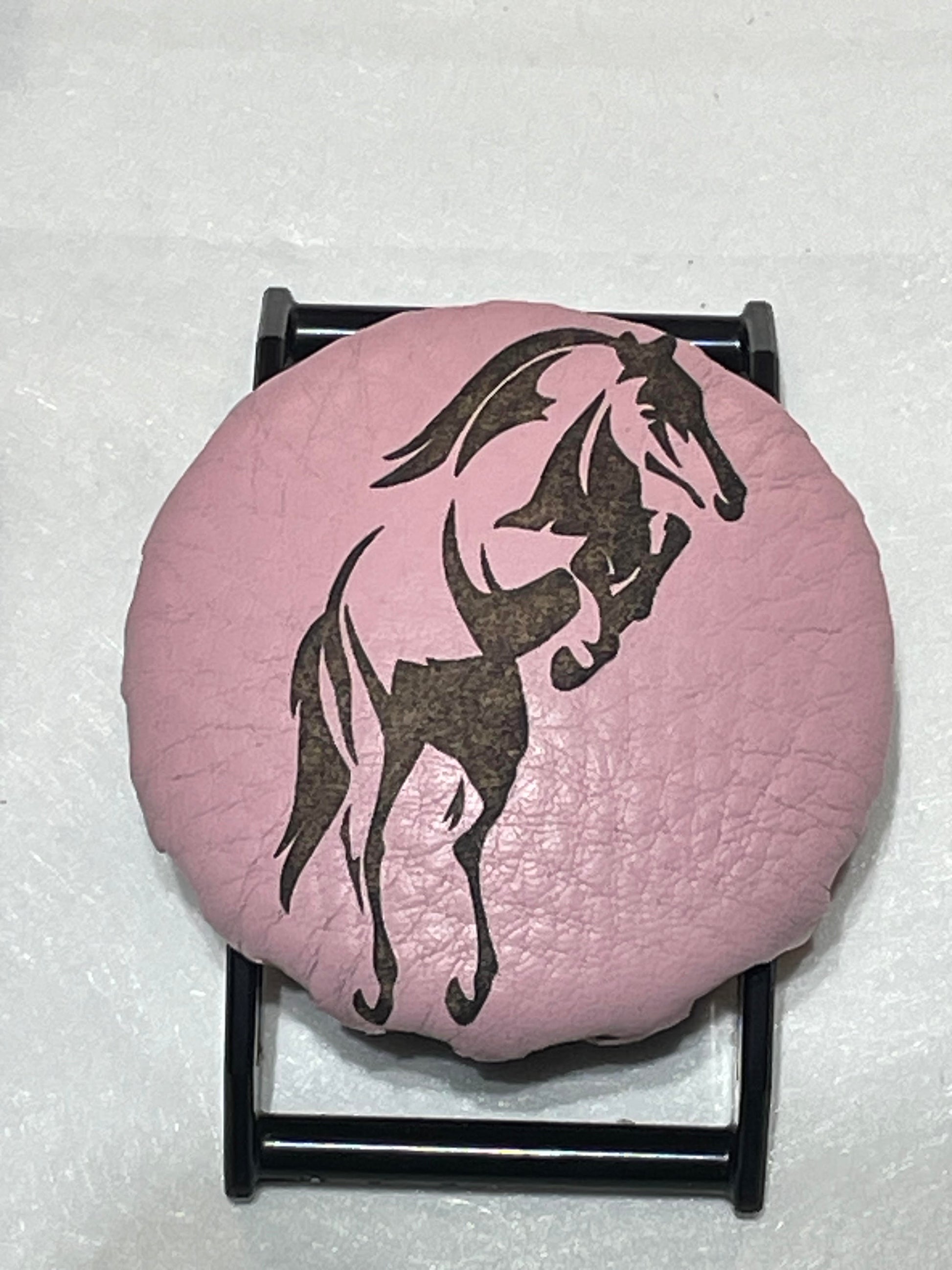 Laser Engraved Jumping Horse on Pink Leather mounted to a black SPEC. All SPECs come with a black Molle compatible clip.