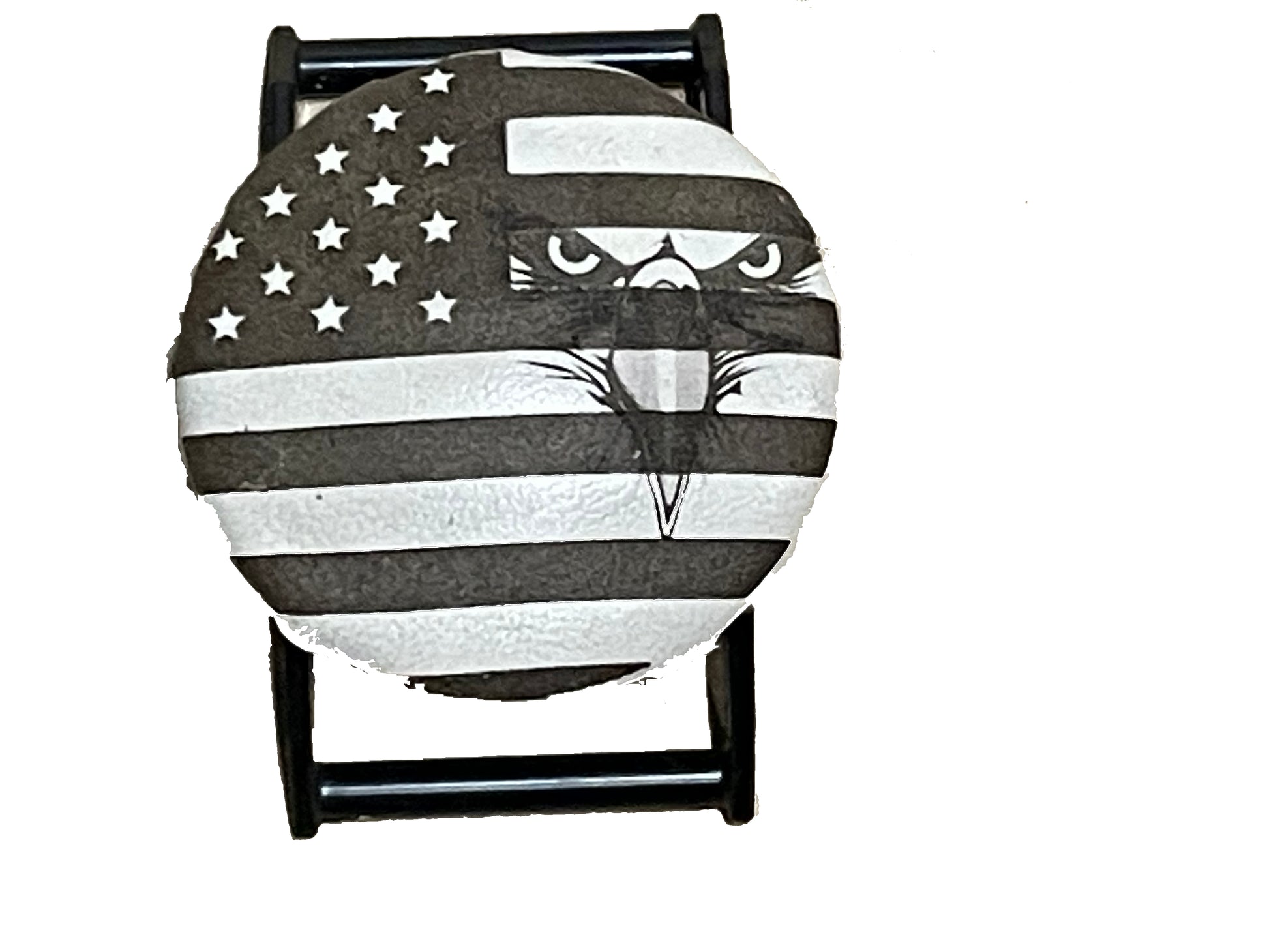 Laser Engraved Leather Glued/Hand Stitched to the SPEC. All SPECs will now come vertically mounted (for using on a vertical strap) and will include a black tactical clip (which will allow you to mount it on a belt while keeping the artwork correctly oriented). You can request a horizontal mount if you would like.