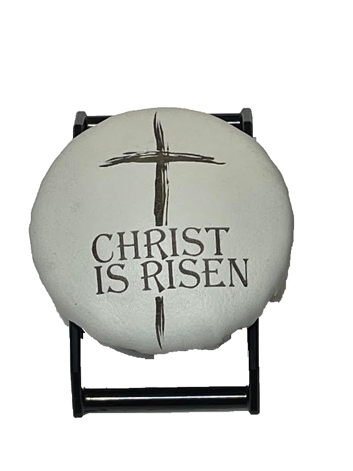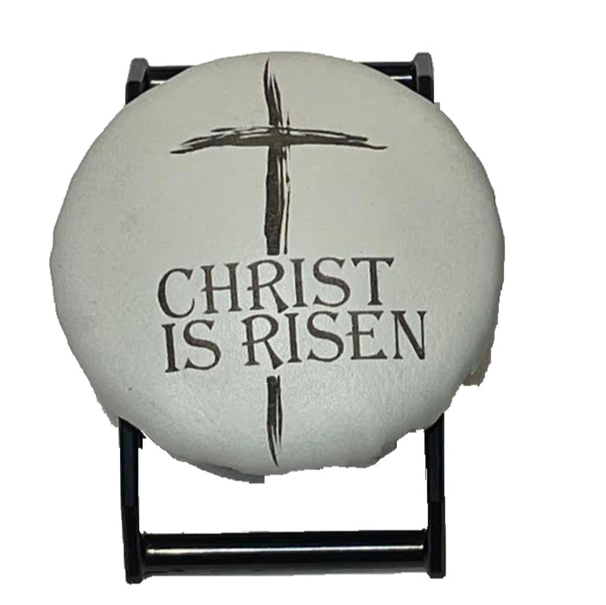 Laser Engraved Christ Is Risen on White Leather mounted to a black SPEC. All SPECs come with a black Molle compatible clip.