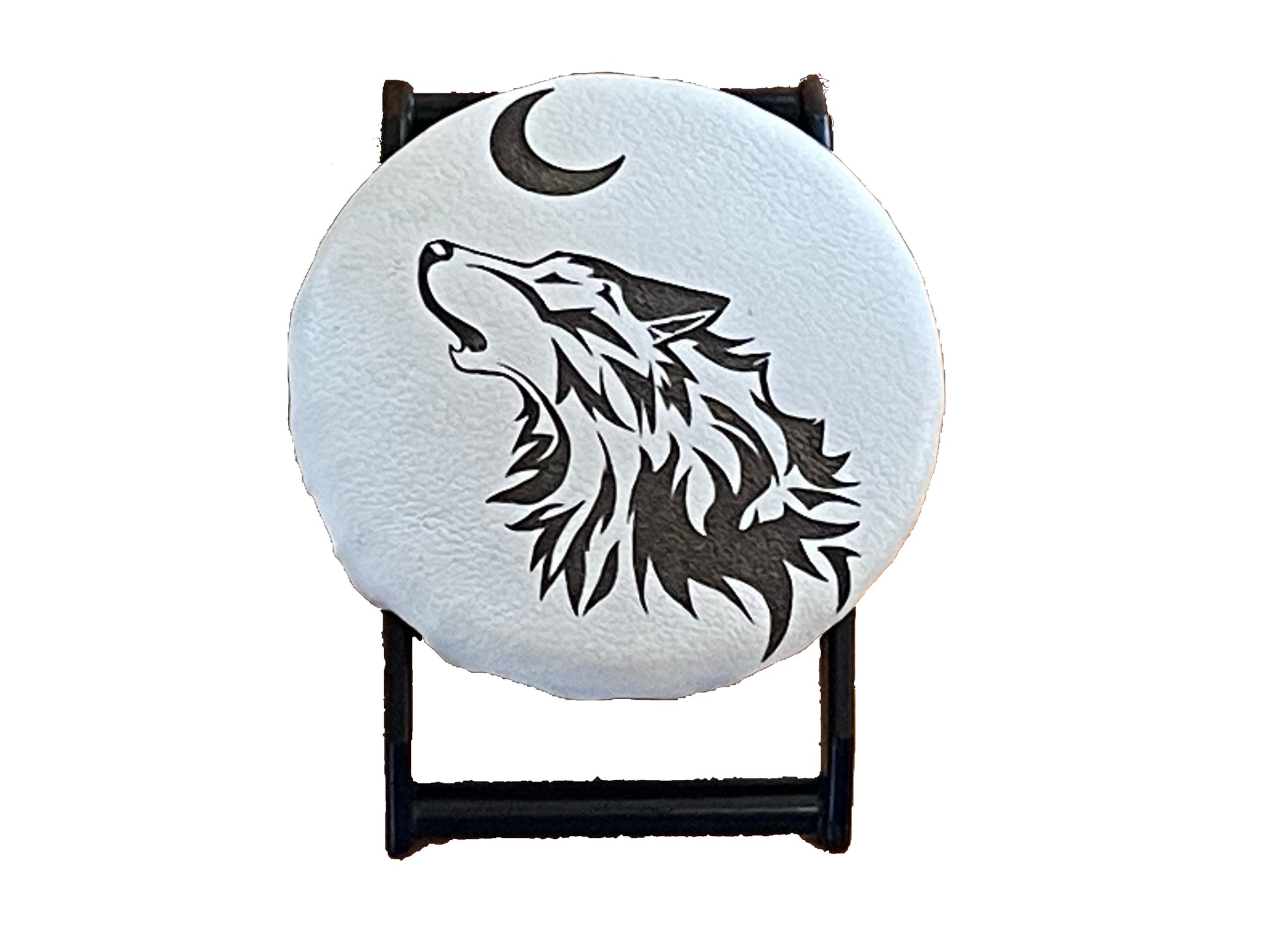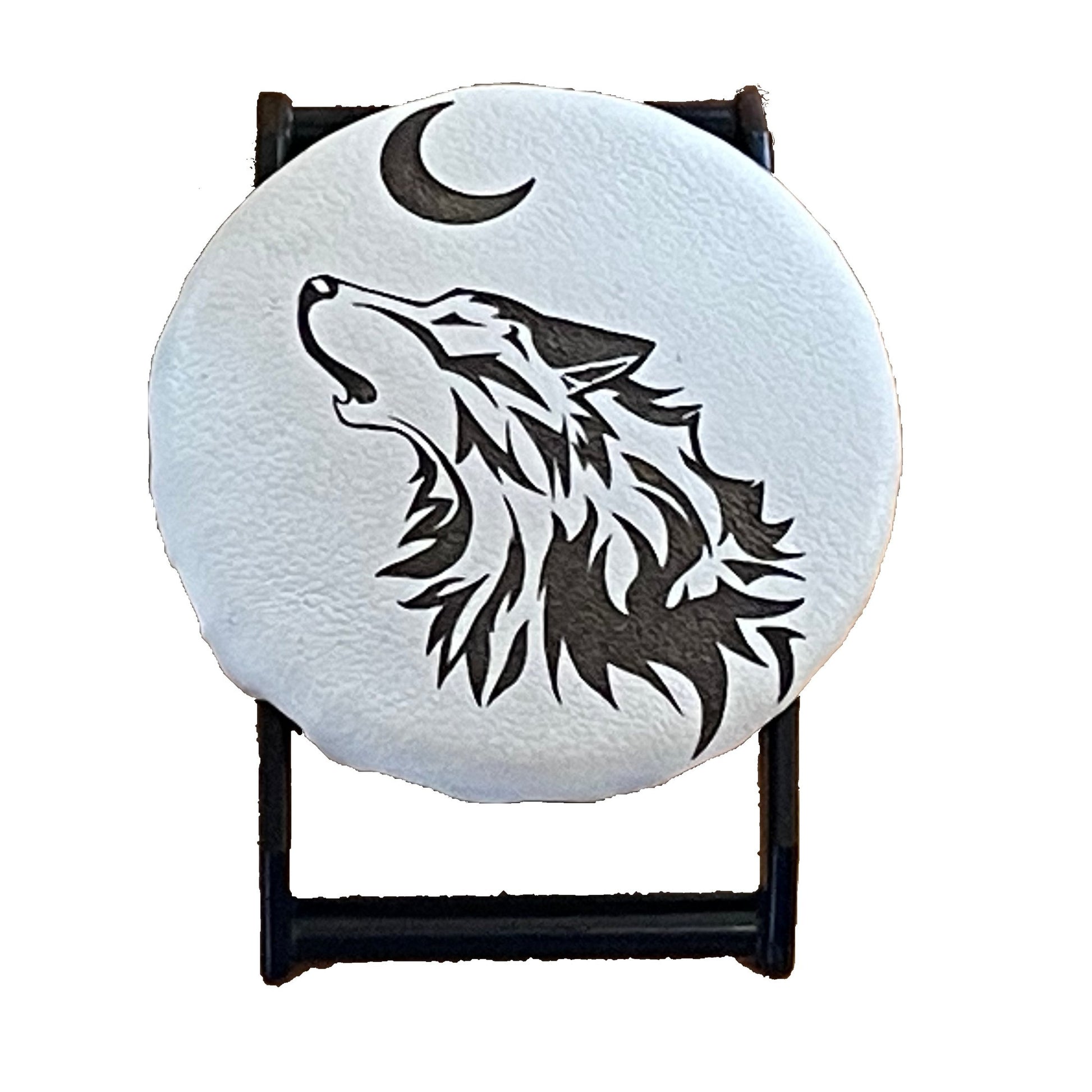 Laser Engraved Wolf on White Leather on Black SPEC. All SPECs come with a black Molle compatible clip.